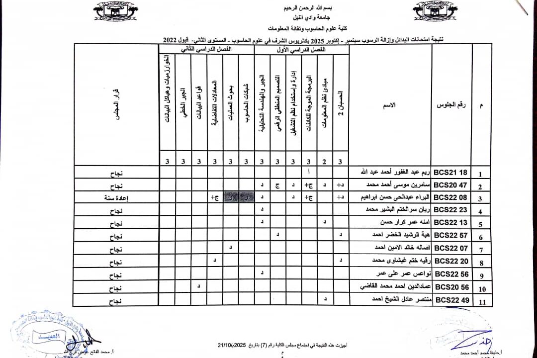 نتيجة امتحانات البدائل وازالة الرسوب سبتمبر _ اكتوبر 2025 بكالريوس الشرف في علوم الحاسوب وتقانة المعلومات ونظم المعلومات (المستوى الثاني _ قبول2022 ) وايضا نتيجة علوم الحاسوب وتقانة المعلومات ونظم المعلومات المستوى الاول الفصل الدراسي ( الاول _ الثاني ) شواغر قبول 2022م _ اكتوبر 2025 م