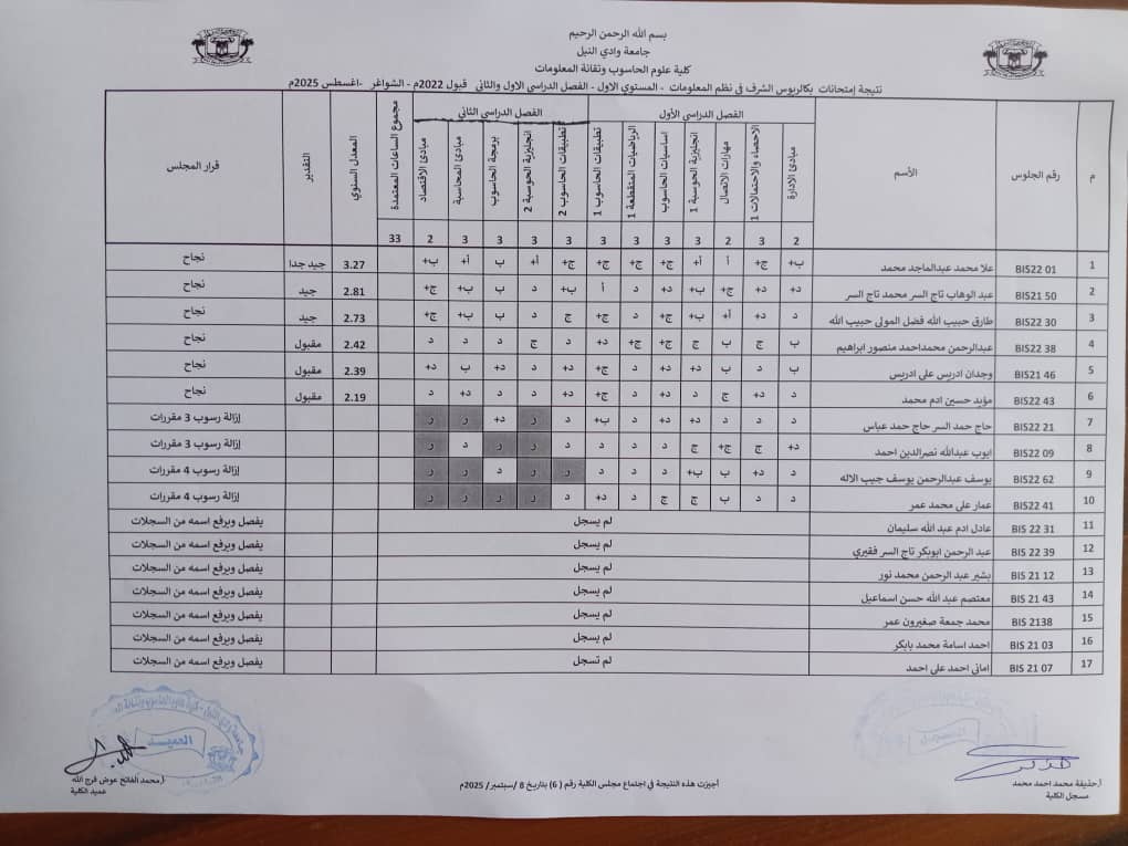 Categories اخر الاخبار نتيجة امتحانات بكالريوس الشرف في نظم المعلومات_ المستوى الاول _ الفصل الدراسي (الاول _الثاني ) قبول 2022م _ الشواغر اغسطس 2025 By admin itc Estimated read time 0 min read سبتمبر 14, 2025