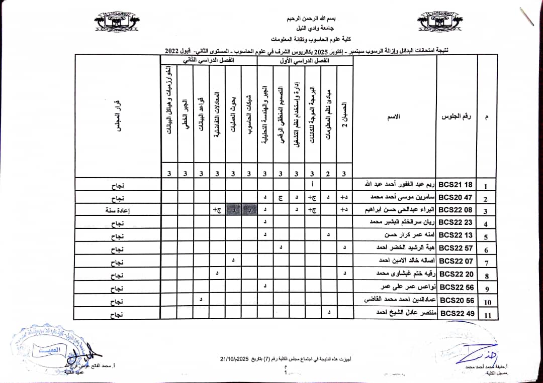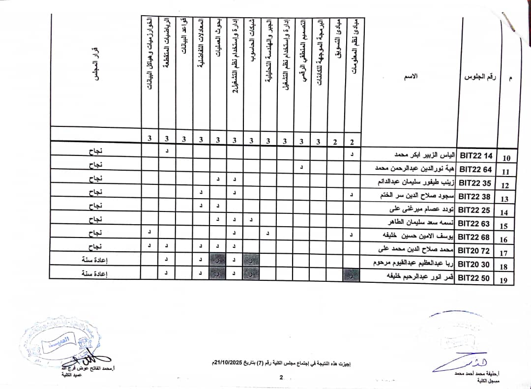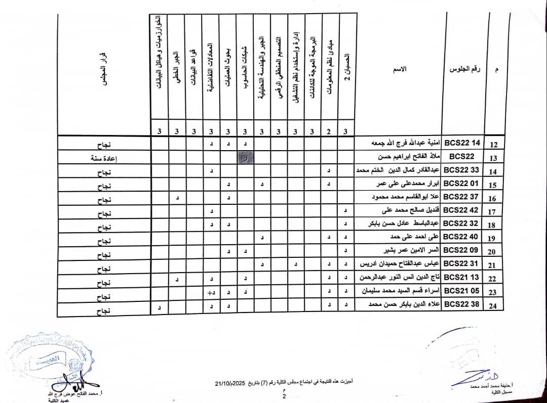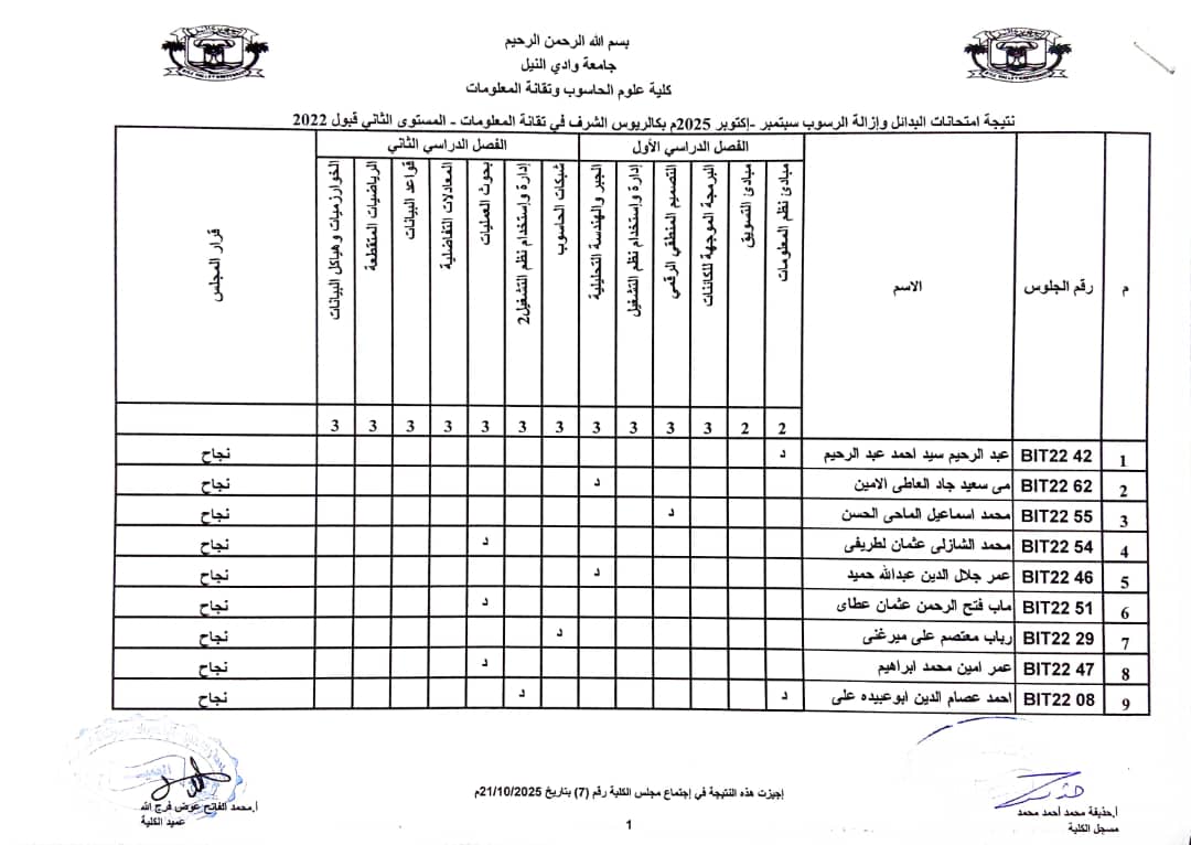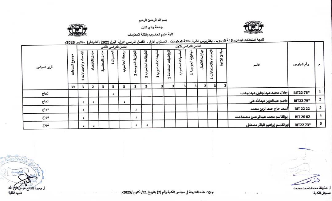نتيجة امتحانات البدائل وازالة الرسوب سبتمبر _ اكتوبر 2025 بكالريوس الشرف في علوم الحاسوب وتقانة المعلومات ونظم المعلومات (المستوى الثاني _ قبول2022 ) وايضا نتيجة علوم الحاسوب وتقانة المعلومات ونظم المعلومات المستوى الاول الفصل الدراسي ( الاول _ الثاني ) شواغر قبول 2022م _ اكتوبر 2025 م