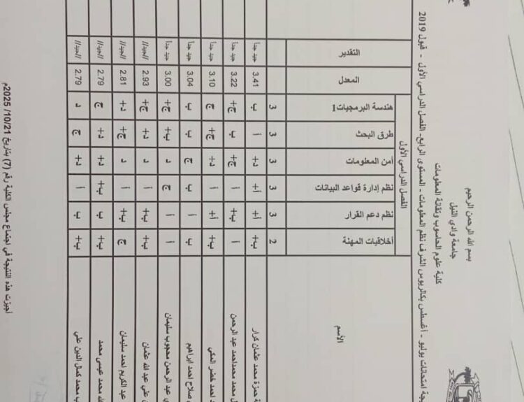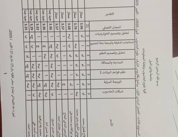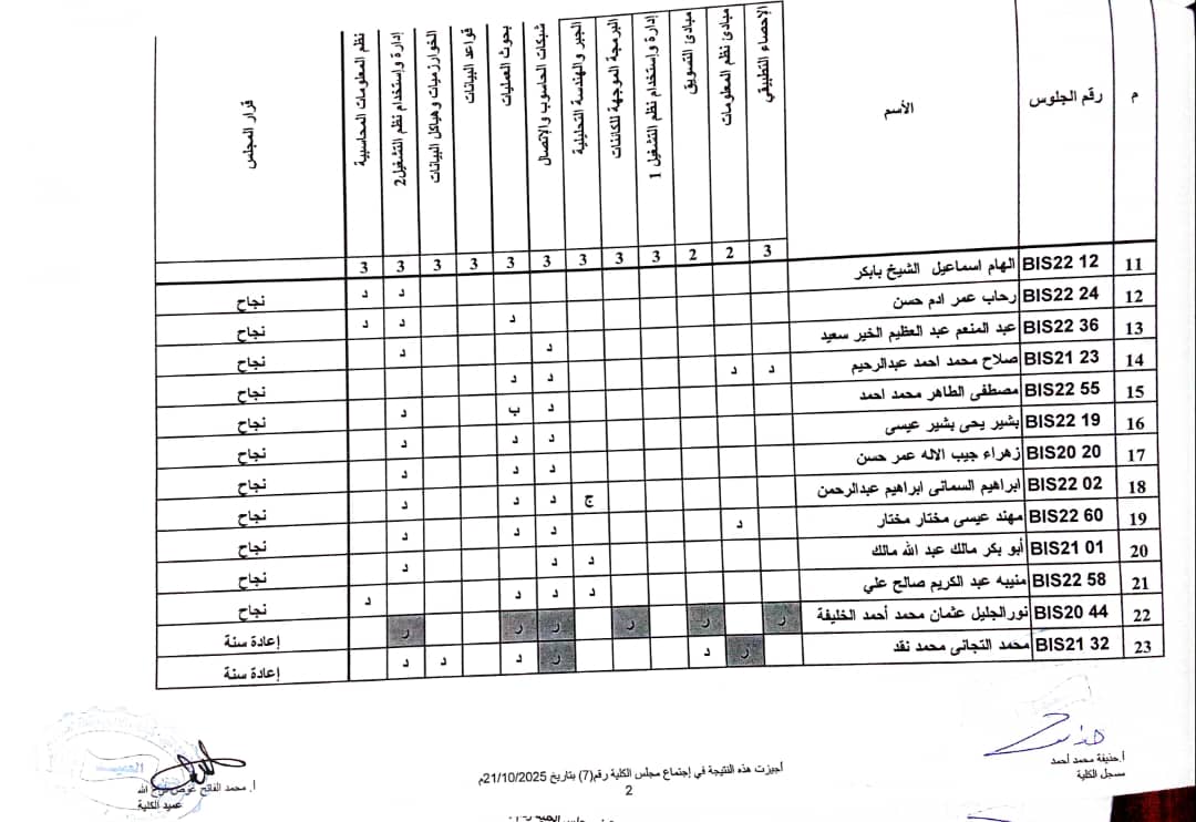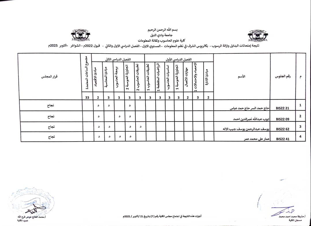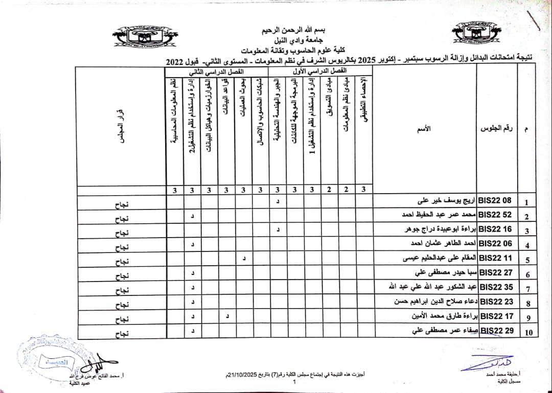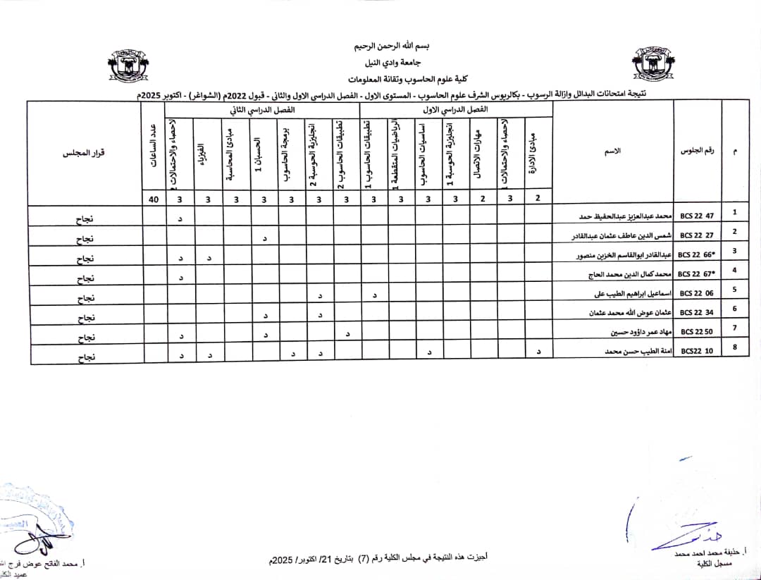 نتيجة امتحانات البدائل وازالة الرسوب سبتمبر _ اكتوبر 2025 بكالريوس الشرف في علوم الحاسوب وتقانة المعلومات ونظم المعلومات (المستوى الثاني _ قبول2022 ) وايضا نتيجة علوم الحاسوب وتقانة المعلومات ونظم المعلومات المستوى الاول الفصل الدراسي ( الاول _ الثاني ) شواغر قبول 2022م _ اكتوبر 2025 م